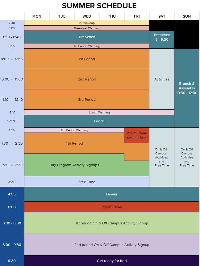 Click the following links for a the weekly schedule for the School Year and the Summer Program.